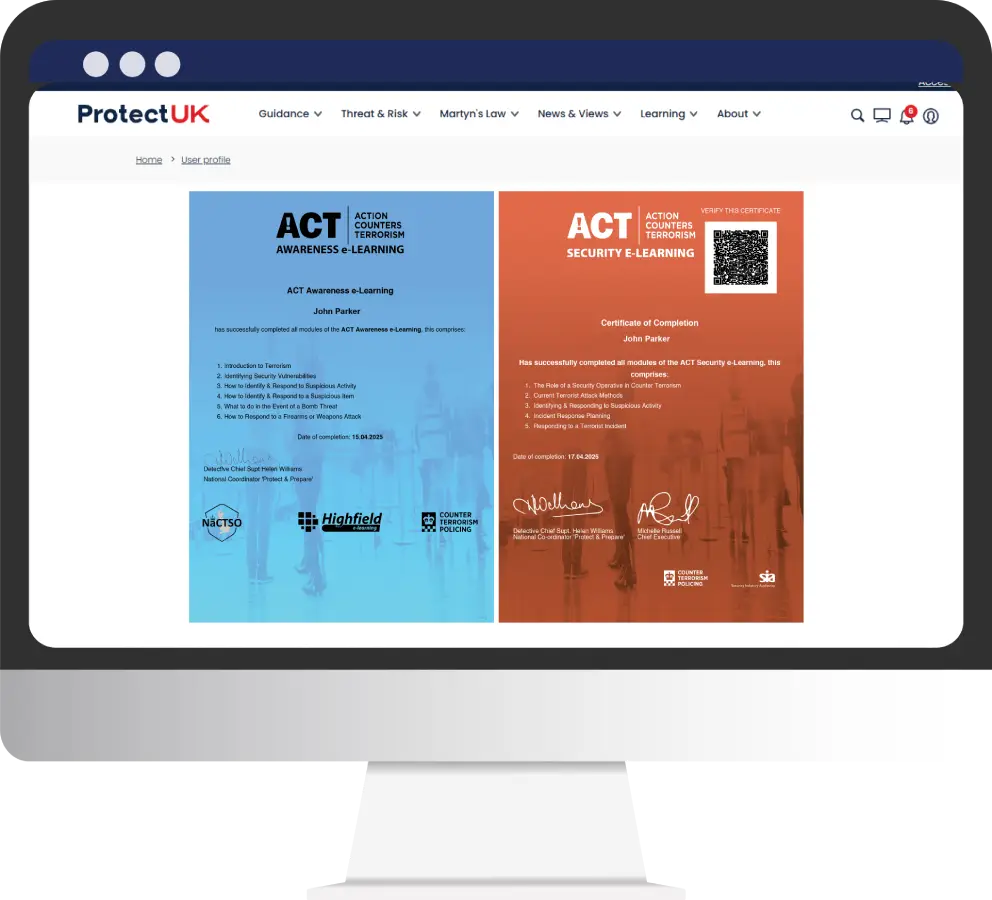 To comply with SIA licensing requirements, all security operatives must complete the Action Counters Terrorism (ACT) Security e-learning and Action Counters Terrorism (ACT) Awareness e-Learning. Follow our guide below to register, complete your modules, and download your certificates.